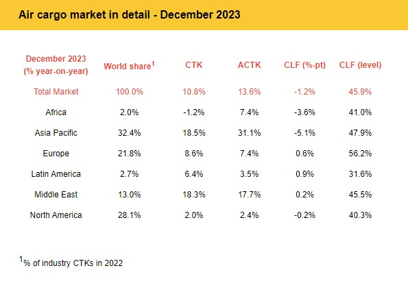 «The recent disruption to maritime routes in the Red Sea has seen some shippers pivot to air cargo. The increased demand saw a spike in air cargo yields on related trade lanes. A similar spike is expected in January as disruptions intensified. While not all cargo is suitable for air transport, it is a vital option for some of the most urgent shipments in extraordinary circumstances. And that is critical to the continuity of the global economy, said Walsh.