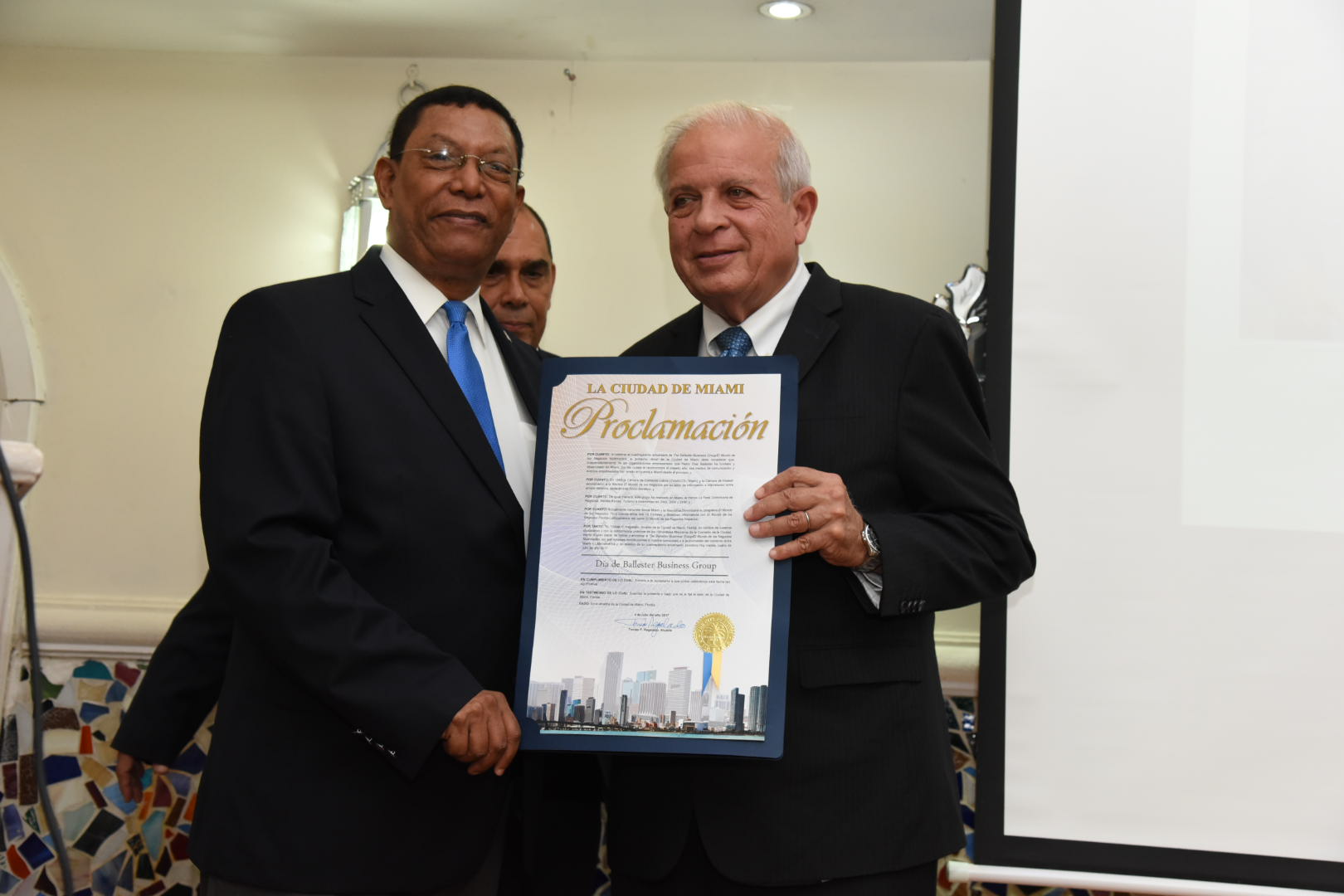 El Almuerzo Empresarial también sirvió de marco para celebrar la Independencia de los ESTADOS UNIDOS de America, como para que el Alcalde Regalado realizara Reconocimiento al empresario de Miami, Efrain Sora, por su labor filantrópica por décadas, en beneficio de jóvenes estudiantes del interior del país. De igual manera, Jose Alvarez, asistente del Alcalde, leyó la Proclama de la Ciudad de Miami, designando el 4 de Julio como “Dia de The Ballester Business Group”, considerando sus aportes a Miami, vía sus medios de comunicación, eventos y otras acciones, con motivo de su “40 Aniversario”, el cual fue entregado por el Alcalde de Miami a Diaz Ballester, presidente del grupo empresarial radicado en la Republica Dominicana y La Florida.