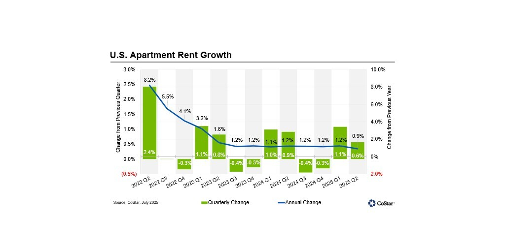 ARLINGTON, Va.–(BUSINESS WIRE)–The national year-over-year asking rent growth for apartments was 0.9% in the second quarter of 2025, slightly slower than the 1.2% recorded in the first quarter. From mid-2023, year-over-year rent growth hovered between 1.0% and 1.2% after its rapid deceleration in 2021 and 2022. This was the first easing of rent growth since the first quarter of 2024.