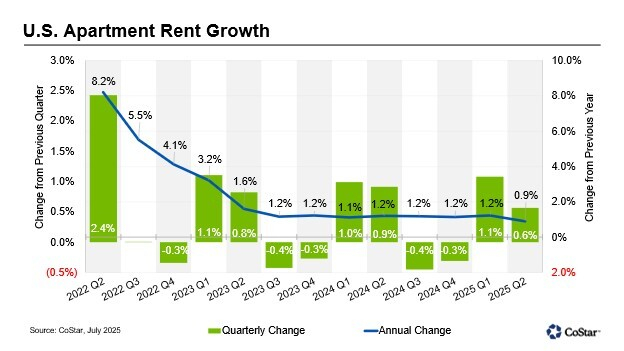 ARLINGTON, Va.–(BUSINESS WIRE)–The national year-over-year asking rent growth for apartments was 0.9% in the second quarter of 2025, slightly slower than the 1.2% recorded in the first quarter. From mid-2023, year-over-year rent growth hovered between 1.0% and 1.2% after its rapid deceleration in 2021 and 2022. This was the first easing of rent growth since the first quarter of 2024.