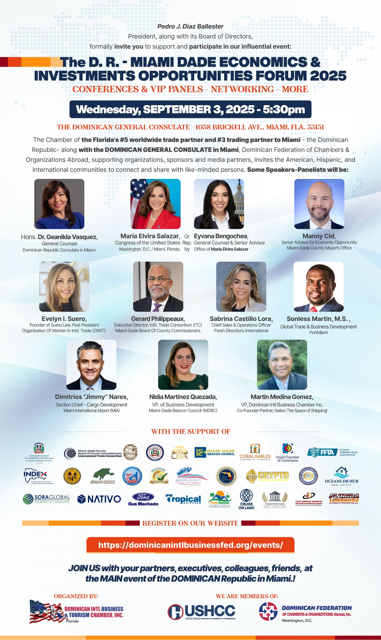 Miami, Florida. September 2, 2025.- The Dominican International Business and Tourism Chamber, in its 32nd year of founding, organizes the «First Economic and Investment Opportunities Forum between Miami-Dade County and the Dominican Republic 2025», to be held this Wednesday, September 3 at the headquarters of the Consulate General of the Dominican Republic, located on Brickell Avenue Miami, starting with a networking at 5:30 pm., continuing with the Forum, and second part of the networking, until 7:30 p.m.