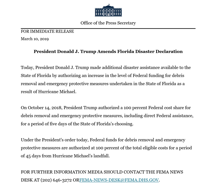 Tallahassee, Fla. – The Federal Emergency Management Agency (FEMA) sent a formal notification to Florida’s congressional delegation informing the state that President Donald J. Trump granted 45 days of 100 percent federal cost share for Hurricane Michael debris removal and emergency protective measures (FEMA Categories A and B).