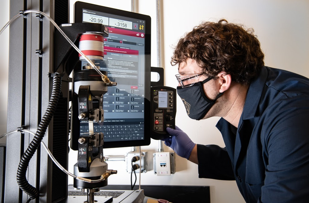 NREL researcher, Nick Rorer, uses a Insteon tool in his lab testing a new PET formulation sample for its tensile properties. Rorer is part of Gregg Beckham’s plastics group, working on the redesign of nylon (aka polyamide) polymers so they can be chemically recycled with more efficient and less energy intensive processes.
