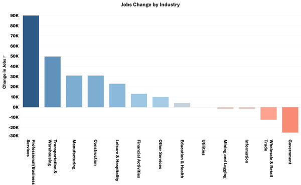 • Professional and business services added 90,000, the most of any industry in November. Transportation and warehousing added 50,000, while Leisure and hospitality added 23,000 jobs in the month. Government shed 25,000 jobs, and retail lost more than 20,000 jobs.