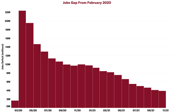 Despite 600,000 more people entering the workforce last month, the labor participation rate still lags pre-pandemic levels. The current labor force participation rate is 1.5 percentage points below pre-pandemic levels — if we had the same participation rate as in February 2020, there would be 4.4 million more workers in the labor force.