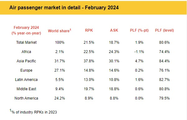 “The strong start to 2024 continued in February with all markets except North America reporting double-digit growth in passenger traffic. There is good reason to be optimistic about the industry’s prospects in 2024 as airlines accelerate investments in decarbonization and passenger demand shows resilience in the face of geopolitical and economic uncertainties. It is critical that politicians resist the temptation of cash grabs with new taxes that could destabilize this positive trajectory and make travel more expensive. In particular, Europe is a worry as it seems determined to lock in its sluggish economic recovery with uncompetitive tax proposals,” said Willie Walsh, IATA’s Director General.